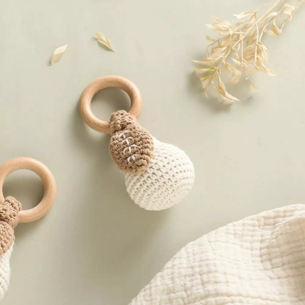 This rattle measures approximately 4 x 4.7 inches and is perfectly sized for tiny hands. Made with a combination of soft yarn and natural wood, it wraps gently around the baby’s wrist like a soft bracelet. The toy produces a gentle sound when shaken, capturing your baby’s attention while helping them recognize cause and effect. With no sharp edges and CE-certified safety, it’s suitable from birth and ideal during the early months of sensory exploration.