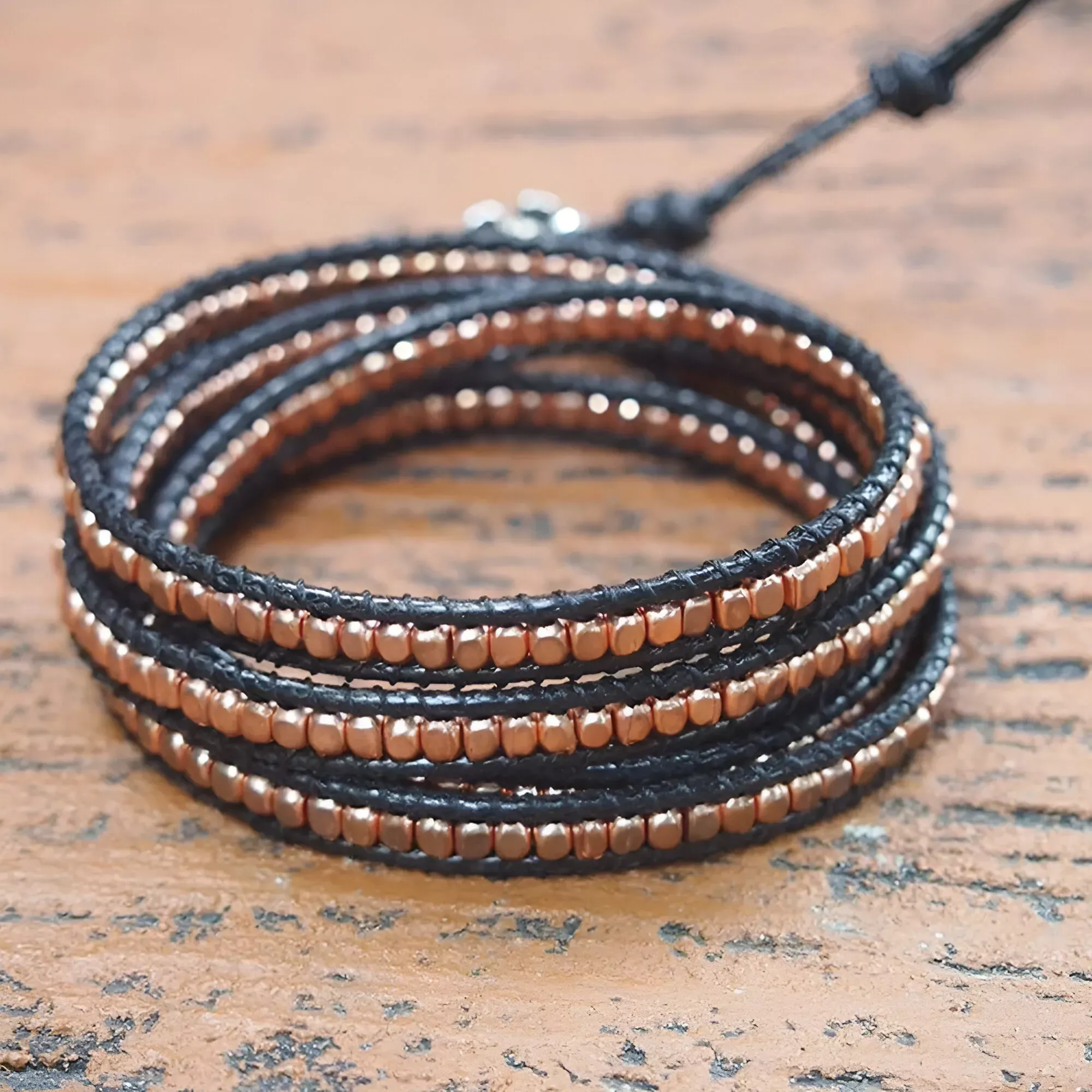 This eye-catching bracelet features rose gold-plated brass beads, artfully handwoven into a five-wrap design that exudes bohemian character. Measuring 32.3 inches (82 cm) in total length, it wraps comfortably around 6 to 7-inch wrists and adjusts for the perfect fit. The secure toggle clasp keeps it in place while you move with confidence. Made from lead- and nickel-free materials, it’s skin-safe and made to last.