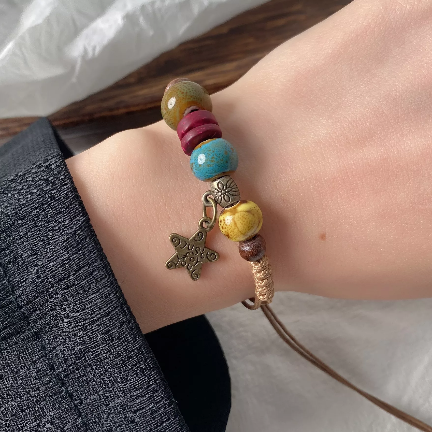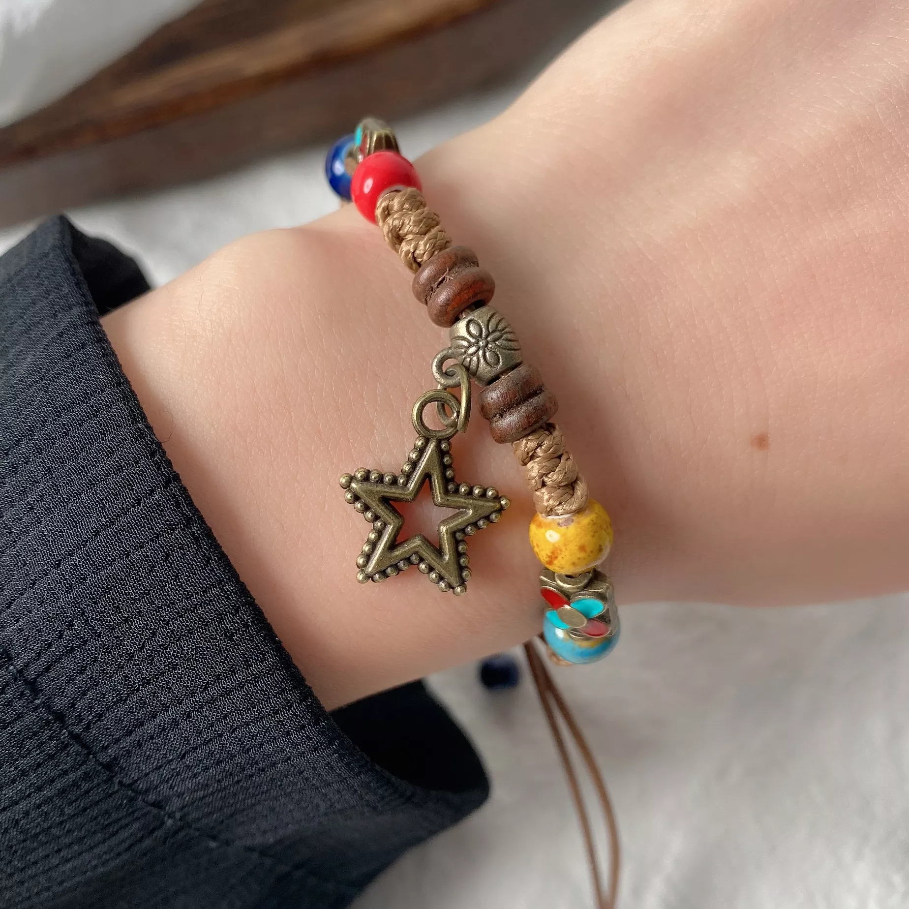 Boho Star Beaded Bracelet – Handmade Ceramic & Wood Vintage Charm