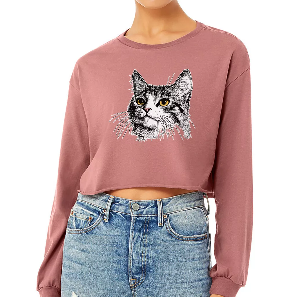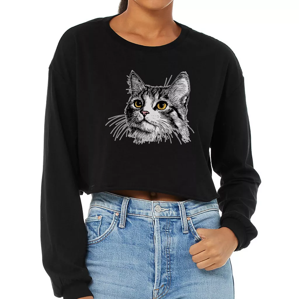 Cat Face Cropped Long Sleeve Sweatshirt – Cat Print Women’s Crop Top – Gift for Cat Lovers Long Sleeves Pullover