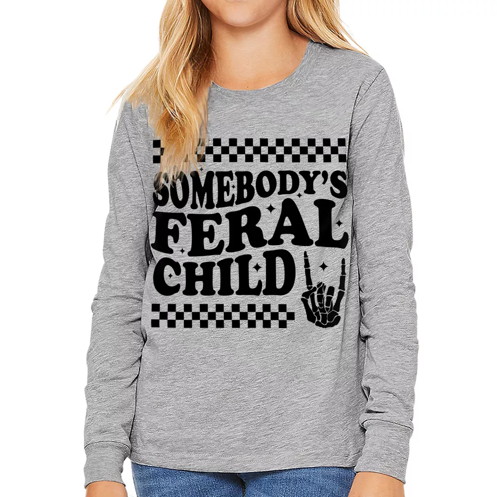 Somebody’s Feral Child Kids’ Long Sleeve T-Shirt – Funny Vintage T-Shirt for Kids – Wild Child Tee for Boys Girls