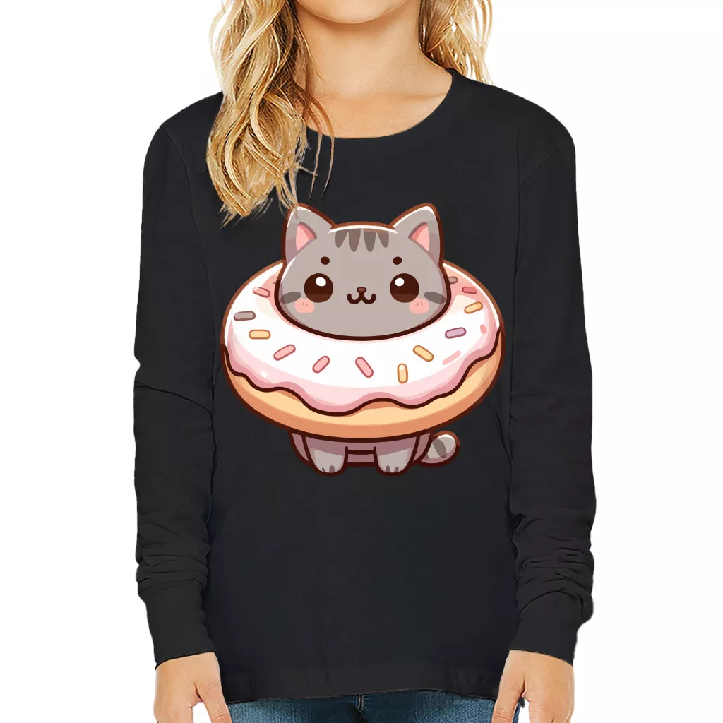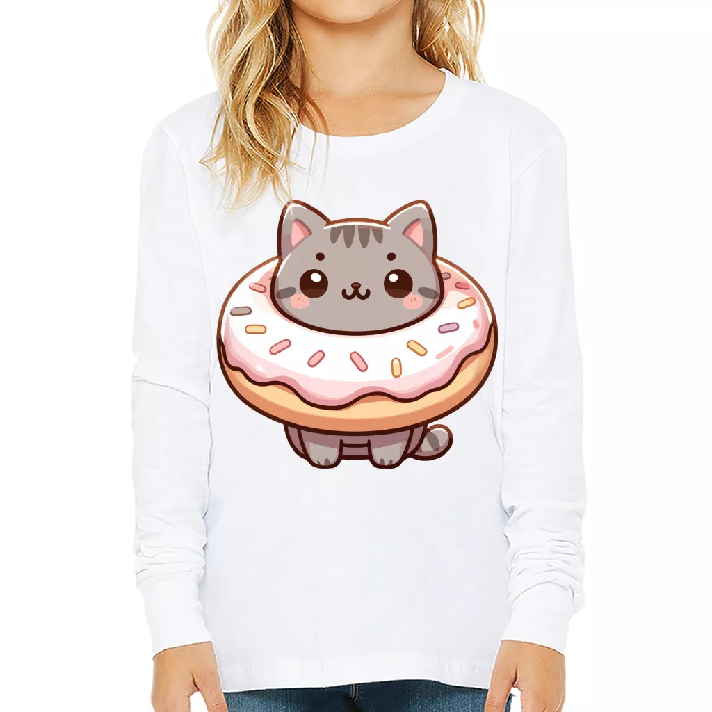 Donut Cat Kids’ Long Sleeve T-Shirt – Kawaii Print T-Shirt for Kids – Cute Design Tee for Boys Girls