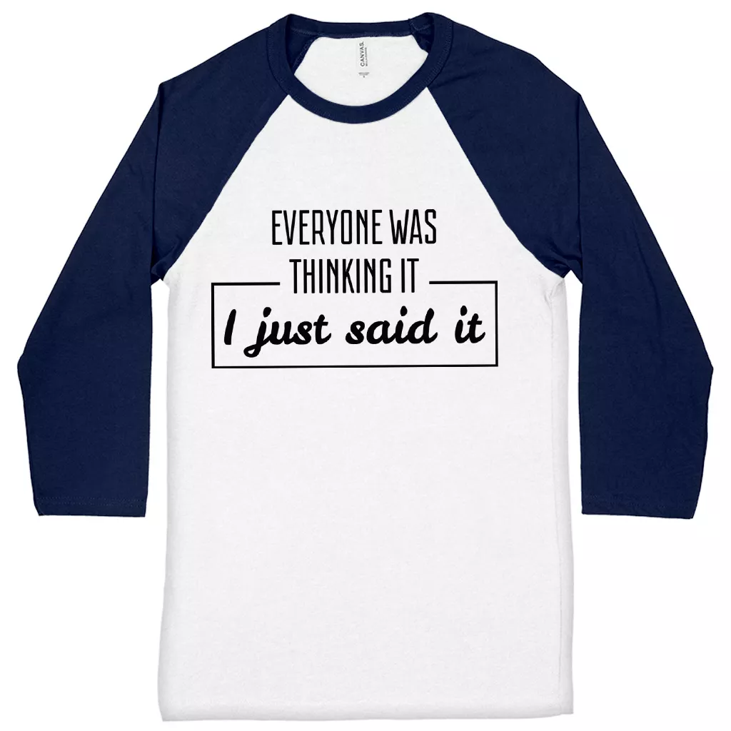Everyone Was Thinking It I Just Said It Baseball T-Shirt is proudly made with 7x less water than average manufacturers, in recycle-friendly facilities that also guarantee zero sweatshop conditions. Funny Graphic 3/4 Sleeve is designed and printed in California.