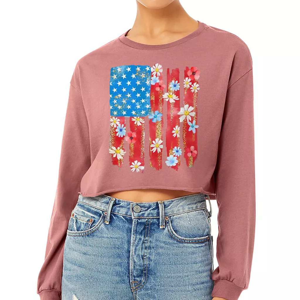 Floral American Flag Cropped Long Sleeve Sweatshirt