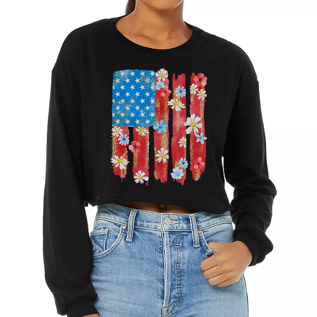 Floral American Flag Cropped Long Sleeve Sweatshirt – 4th Of July Women’s Crop Top – Patriotic Graphic Long Sleeves Pullover