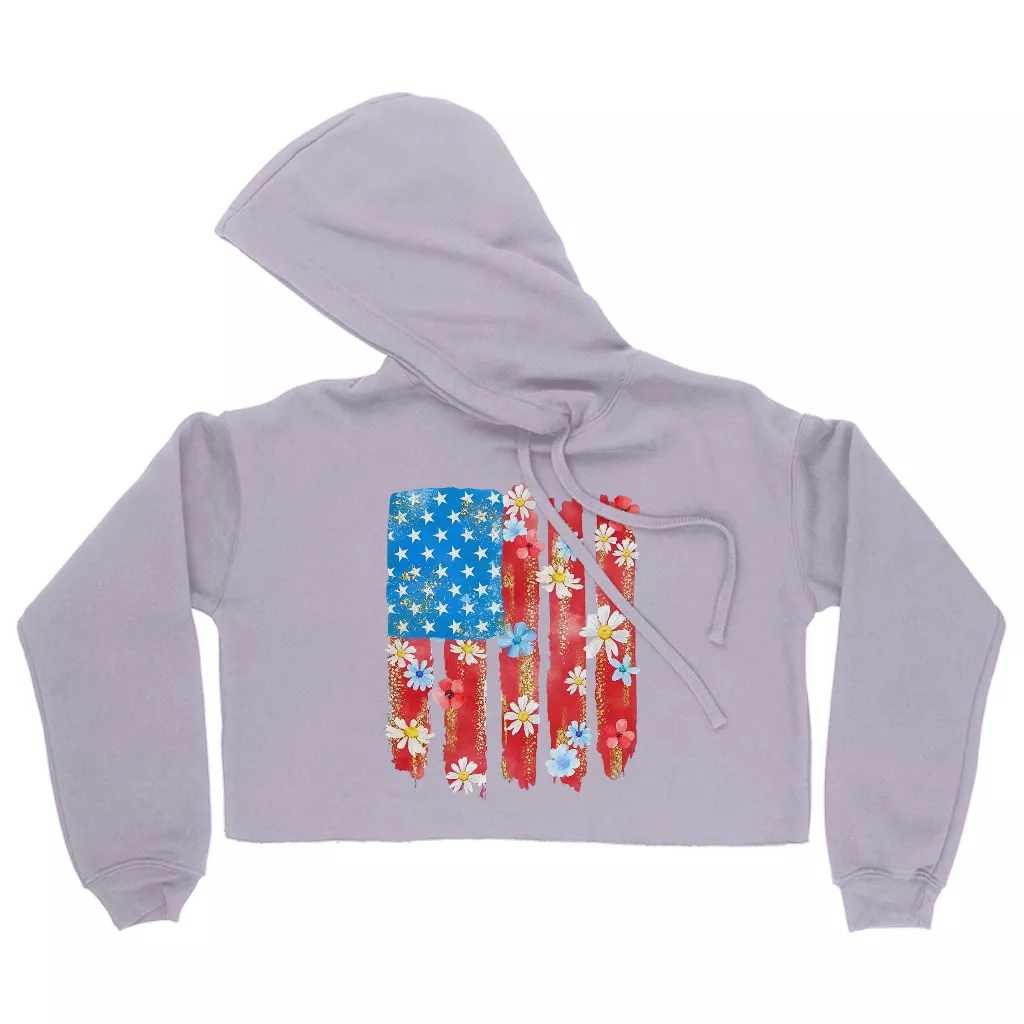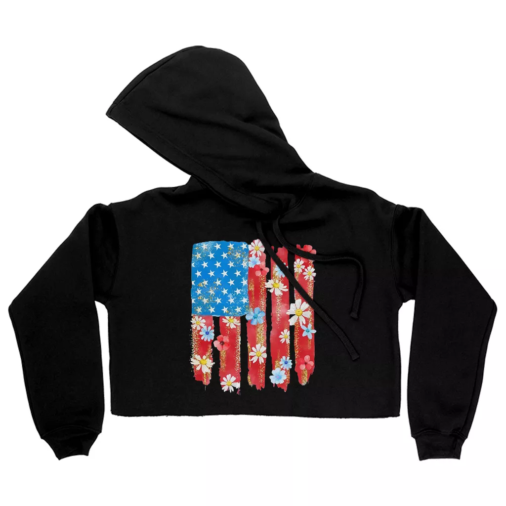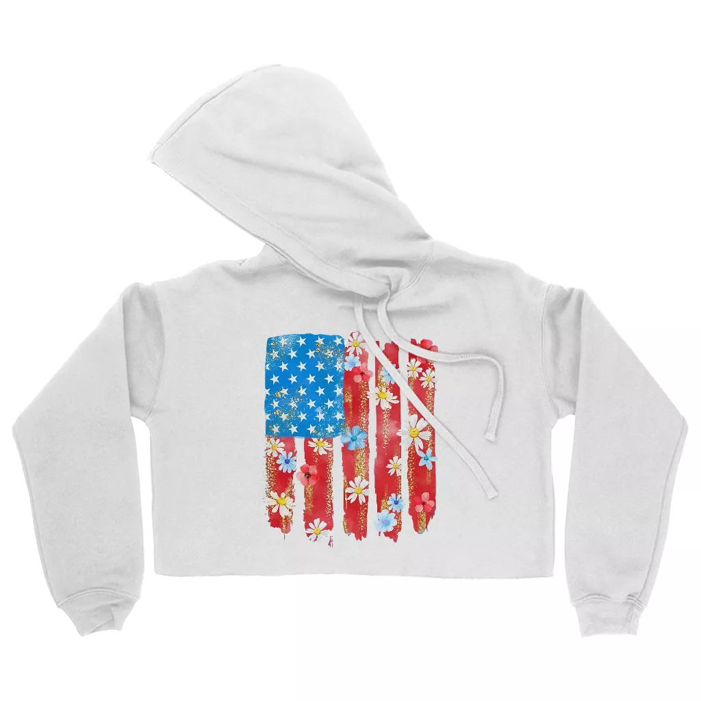Floral American Flag Women’s Cropped Hoodie – 4th Of July Hooded Sweatshirt – Patriotic Graphic Super Crop Top Hoodies