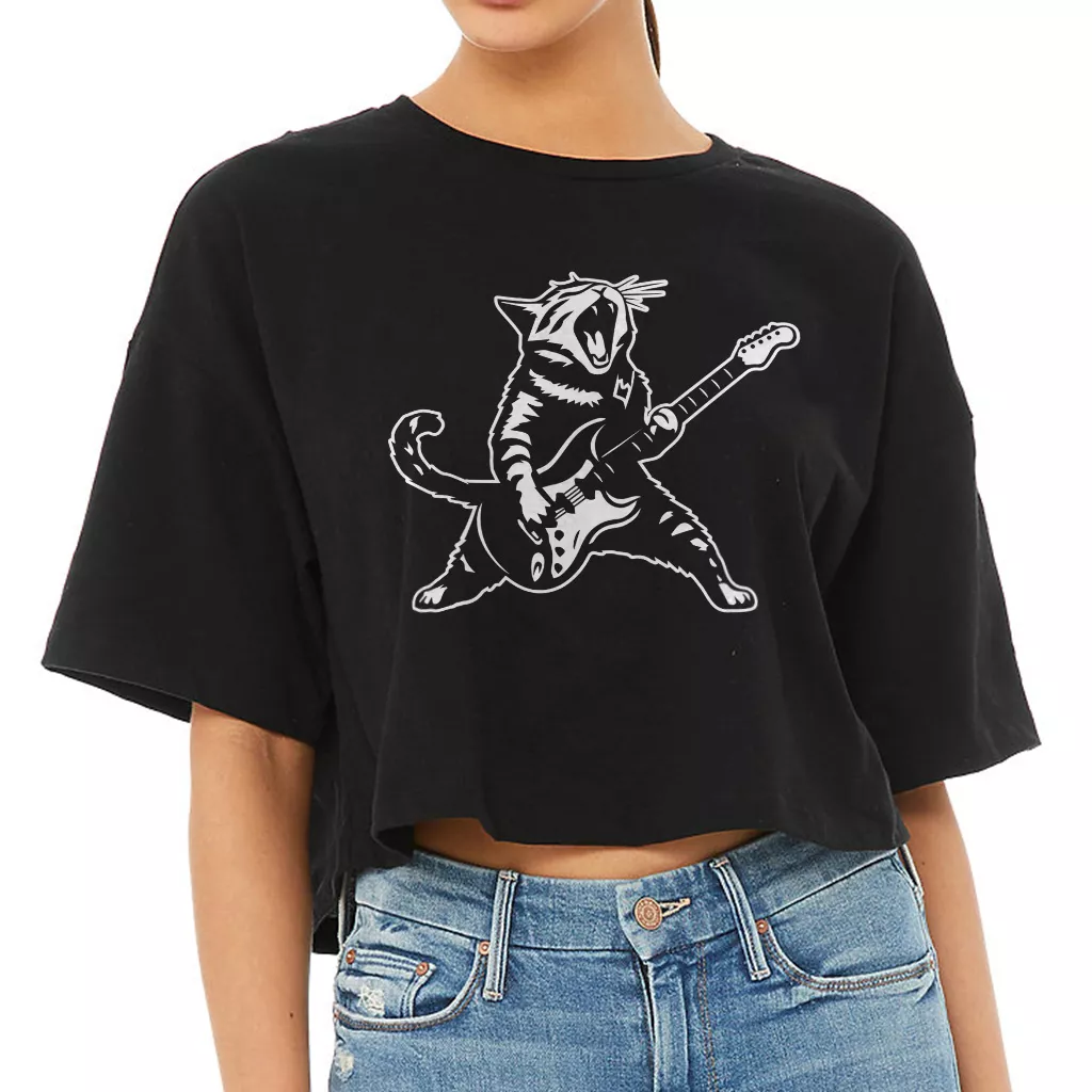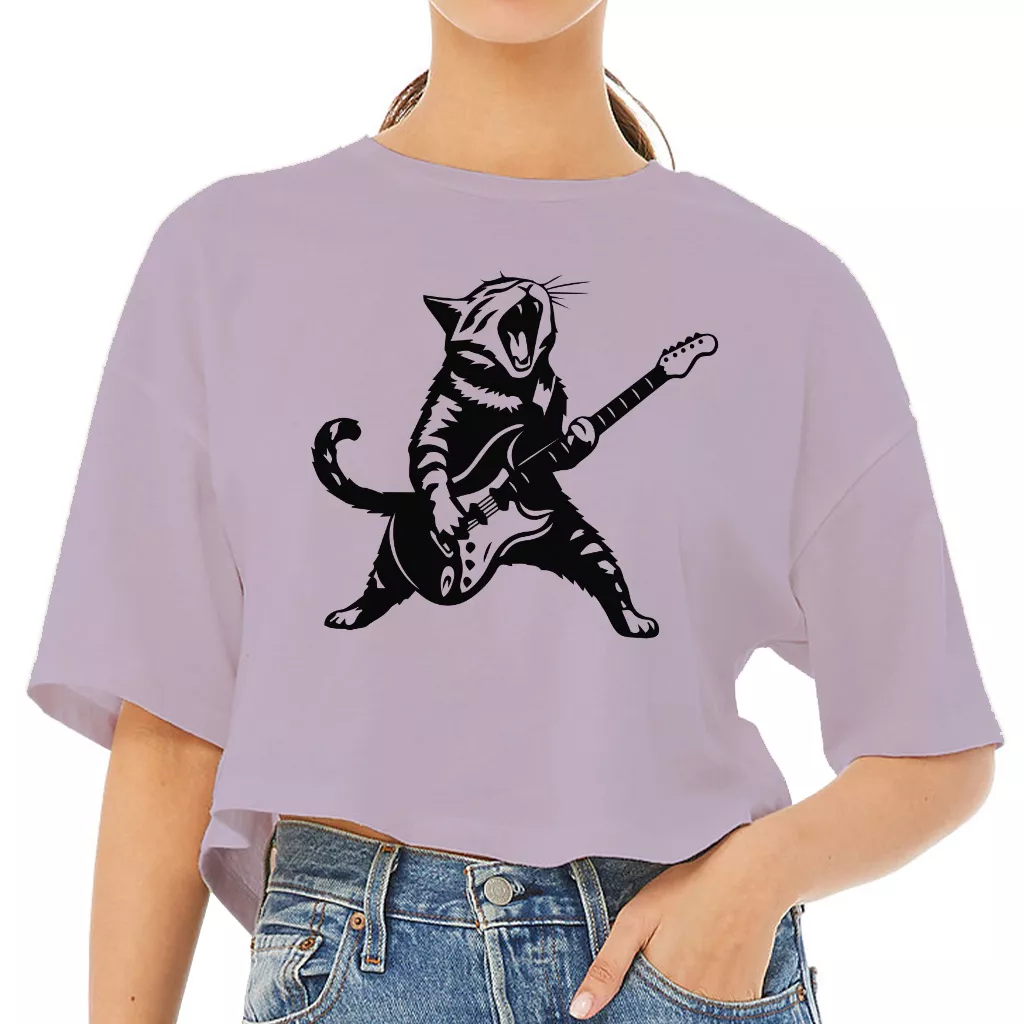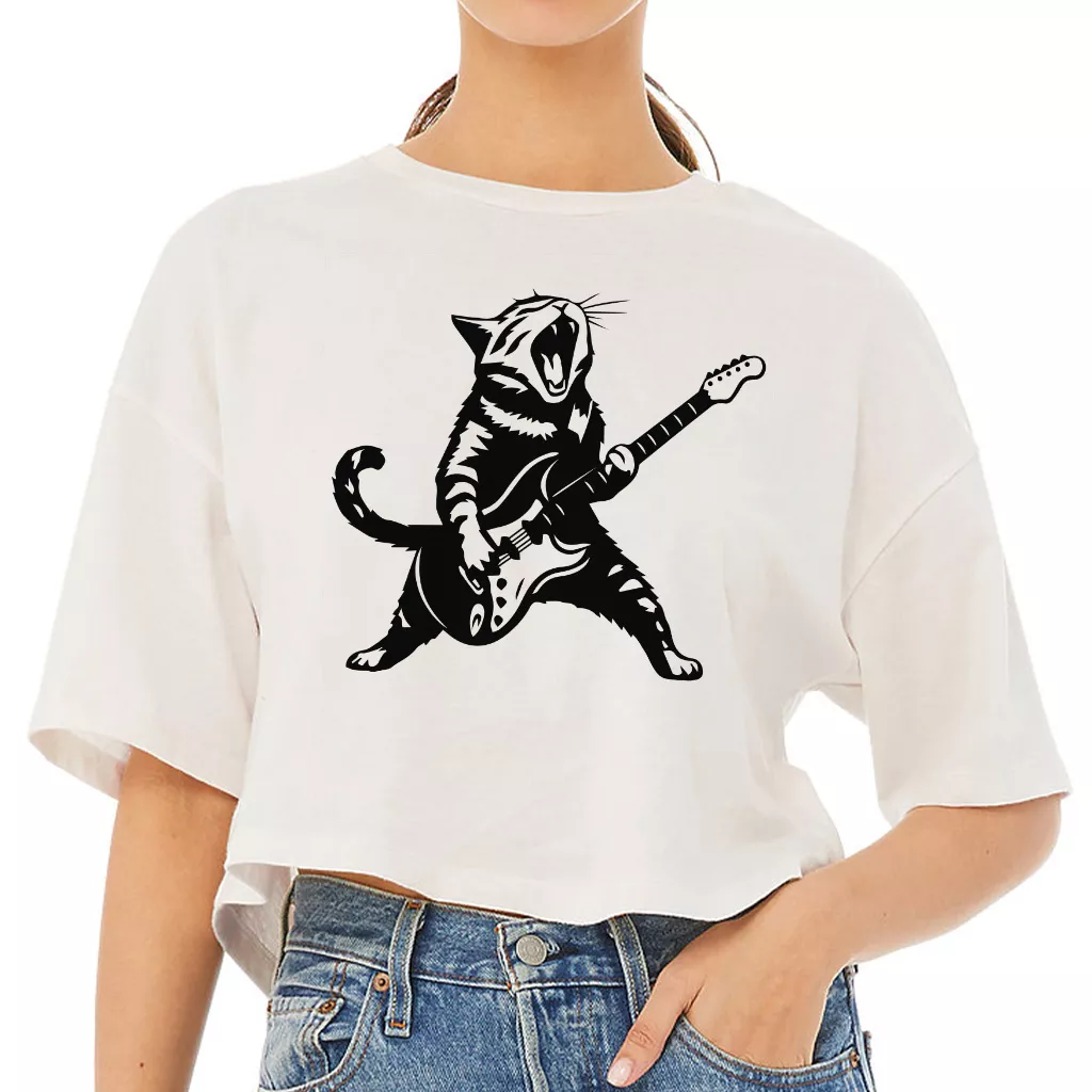 Funny Guitar Cat Cropped T-Shirt – Cool Cat Print Trendy Tee – Cat Themed Gift Women’s Basic T-Shirt