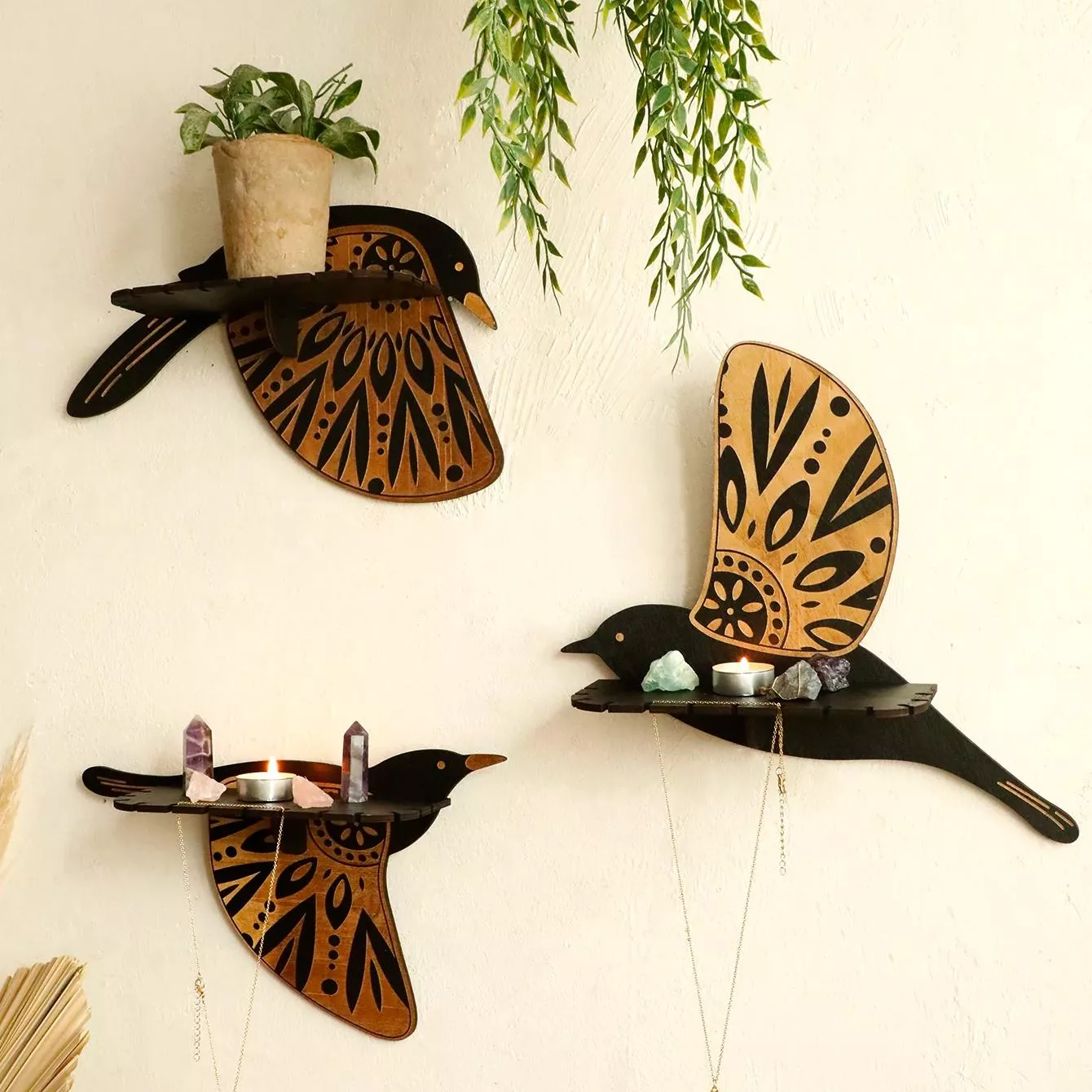 Gothic Black Bird Wall Shelf – Vintage Wooden Floating Decor for Any Room