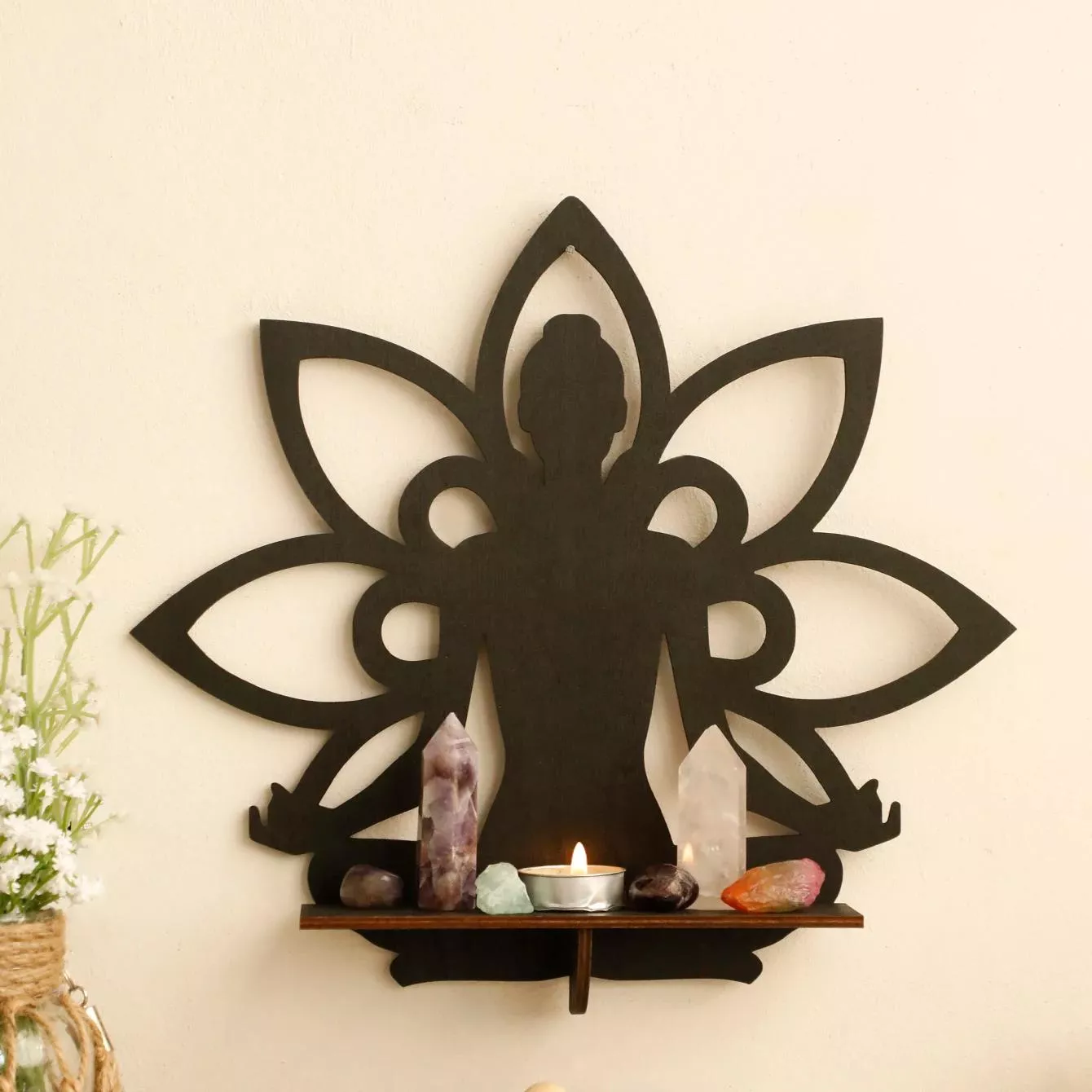 Buddha Wooden Wall Shelf – Boho Lotus Crystal Display Stand for Home Décor