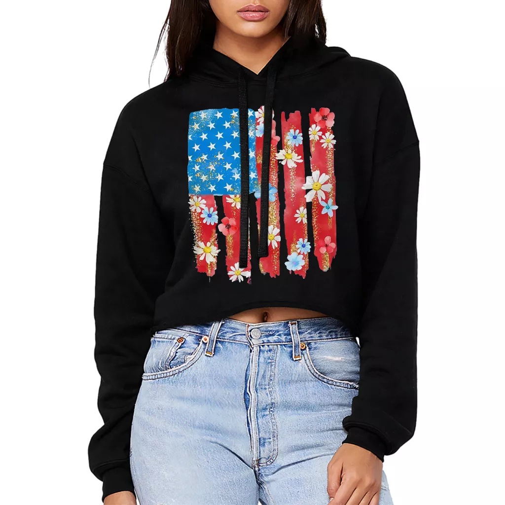 Floral American Flag Women’s Cropped Hoodie – 4th Of July Hooded Sweatshirt – Patriotic Graphic Super Crop Top Hoodies