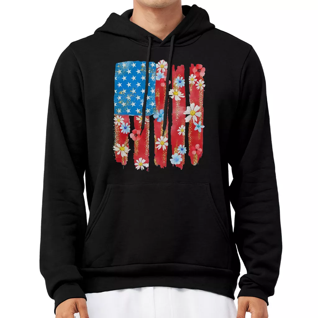 Floral American Flag Hoodie – 4th Of July Hooded Sweatshirt – Patriotic Graphic Unisex Hoodie