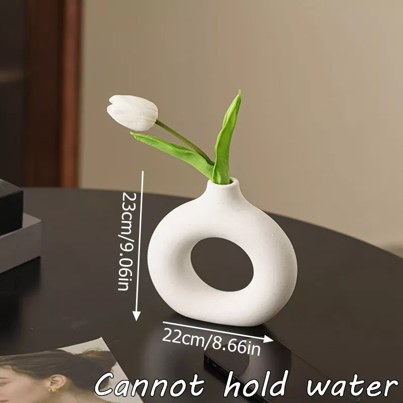 Transform your home or event into a stunning showcase with the Imitation Ceramic Pure White Donut Design Decorative Vase. This modern and minimalist vase effortlessly enhances any decor style, from family rooms to banquet halls. Its sleek design and neutral color make it the perfect accent piece for dried flowers, adding a touch of sophistication to any setting.