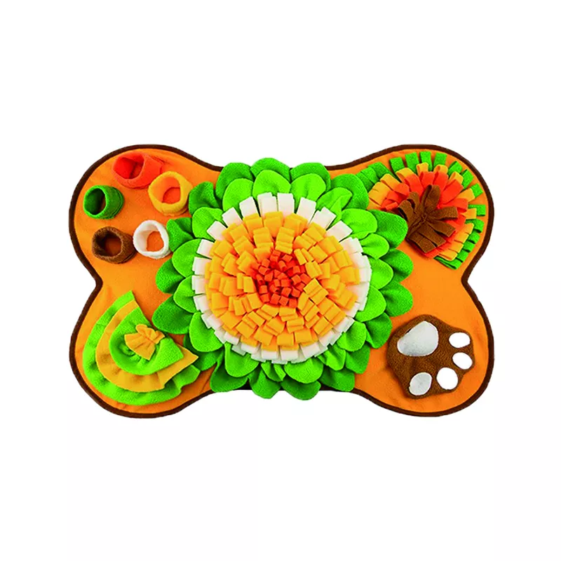 This smell training blanket features a vibrant, multi-layered flower-shaped structure that makes hiding treats extra fun and challenging. Five built-in feeding bowls allow for a variety of food options. An added squeaker hidden in one of the paw pads offers extra excitement, engaging your dog’s attention and encouraging interactive play. Designed with safety and comfort in mind, the soft fleece surface is gentle on noses and paws, while the non-slip bottom keeps it firmly in place.