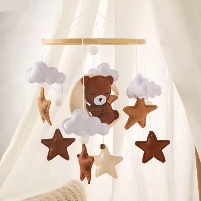 Wooden Baby Crib Mobile with Velvet Teddy Bears and Music Box