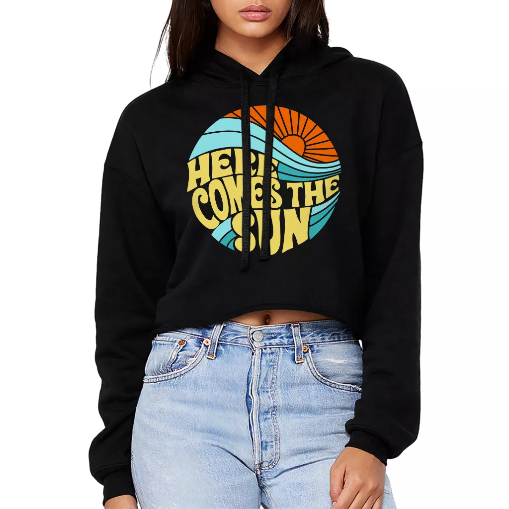 Here Comes the Sun Tee Women’s Cropped Hoodie – Retro Style Hooded Sweatshirt – Vintage Inspired Super Crop Top Hoodies