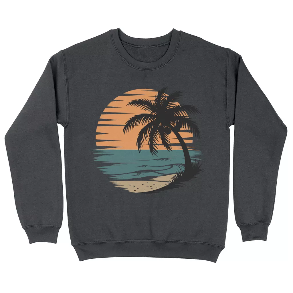Retro Tropical Sunset Sweatshirt is made from a 50% U.S. Cotton/50% Polyester blend, this warm 8.0 oz sq/yd classic fit style looks great and makes a great canvas for decorating. Retro Tropical Sunset Sweatshirt is designed and printed in California.
