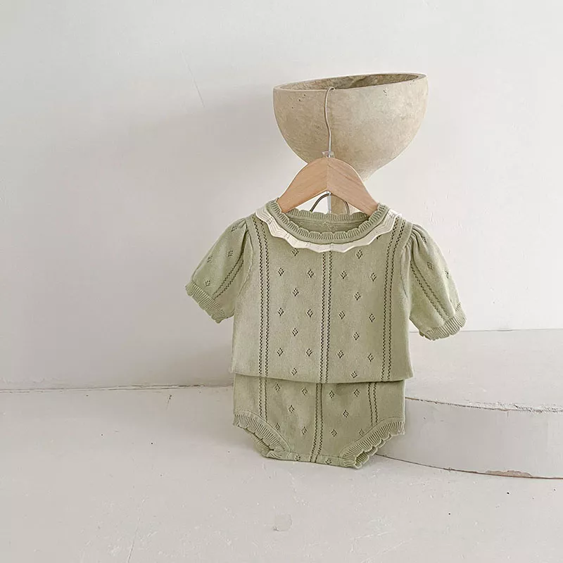 The knit tee with its delicate lace details and soft texture pairs beautifully with the matching shorts, making it a go-to outfit for any casual outing or day at the park. The set is available in two lovely colors, giving you options to suit your child’s unique style. Whether for a playdate, family gathering, or just a relaxed day around the house, this set is sure to become a favorite in your baby’s wardrobe.