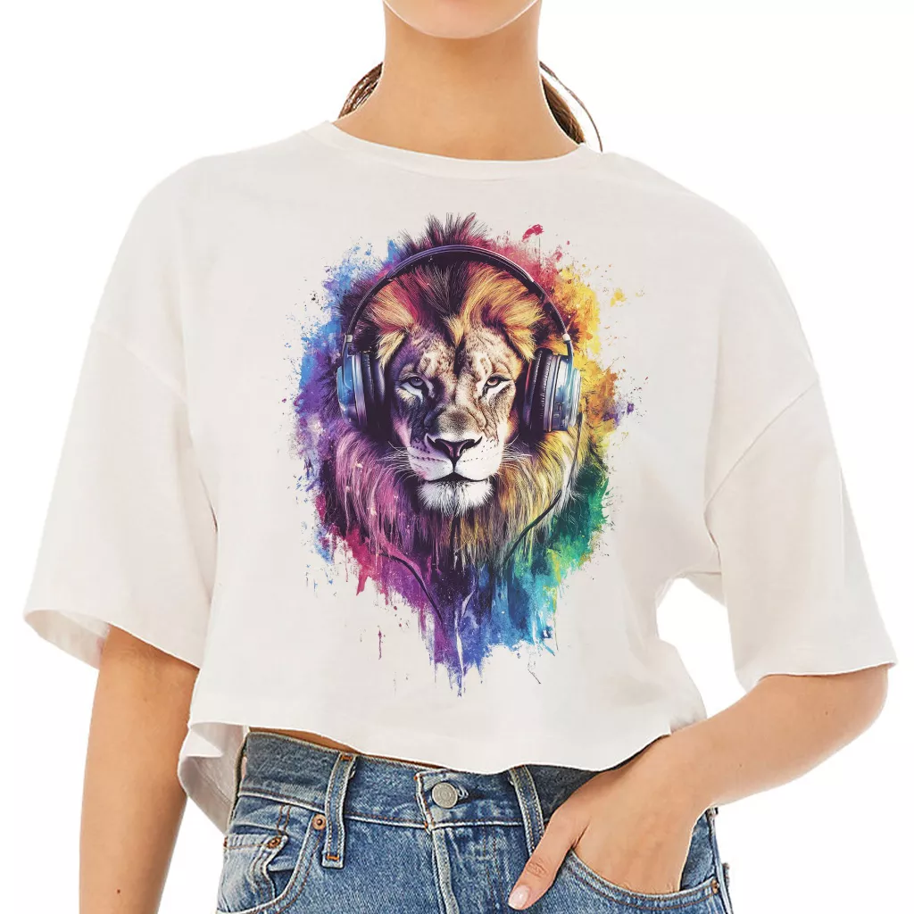 Cool Lion Cropped T-Shirt – Lion Face Design Trendy Tee – Animal Print Women’s Basic T-Shirt