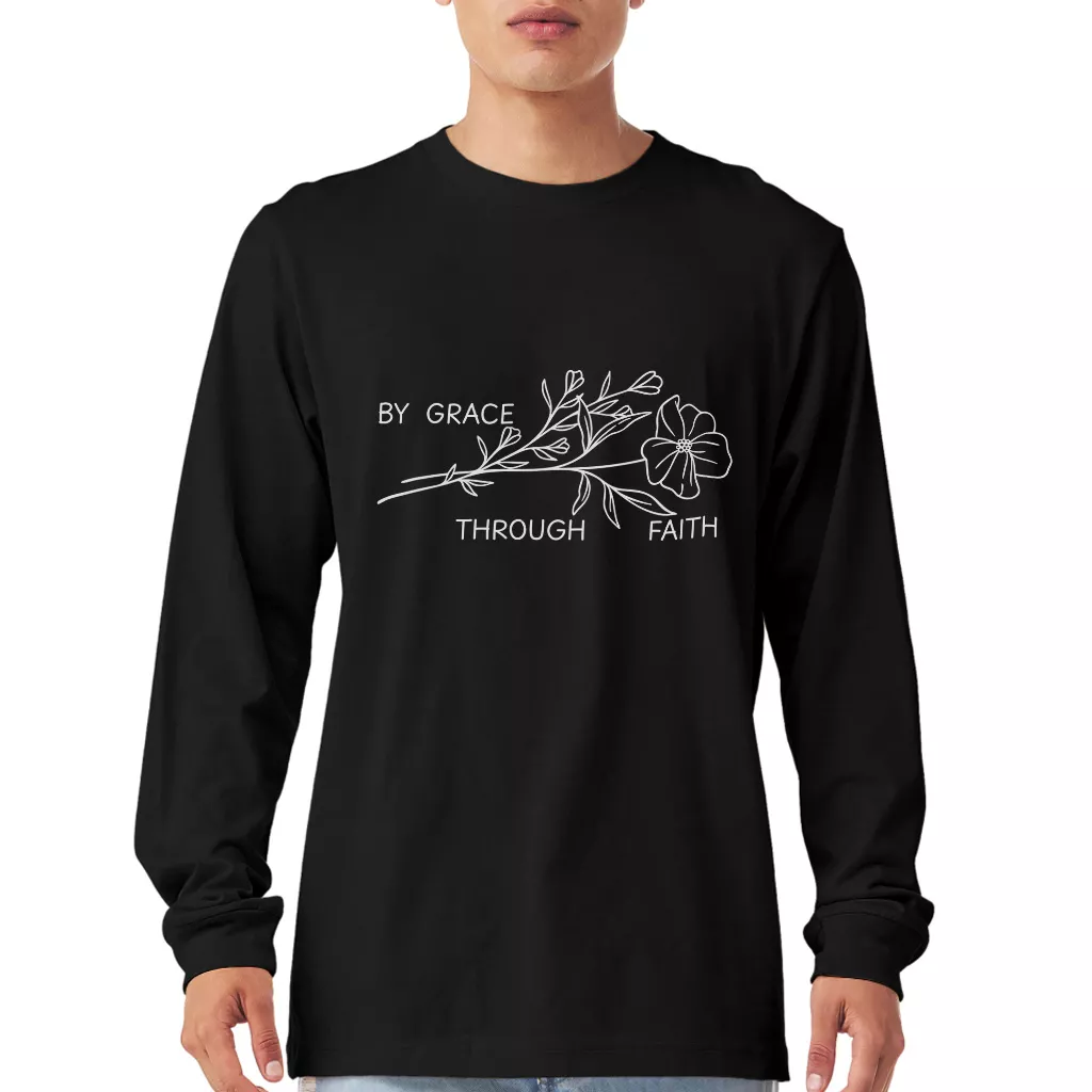 By Grace Through Faith Long Sleeve T-Shirt – Minimalist Christian T-Shirt – Faith Quote Basic Tee
