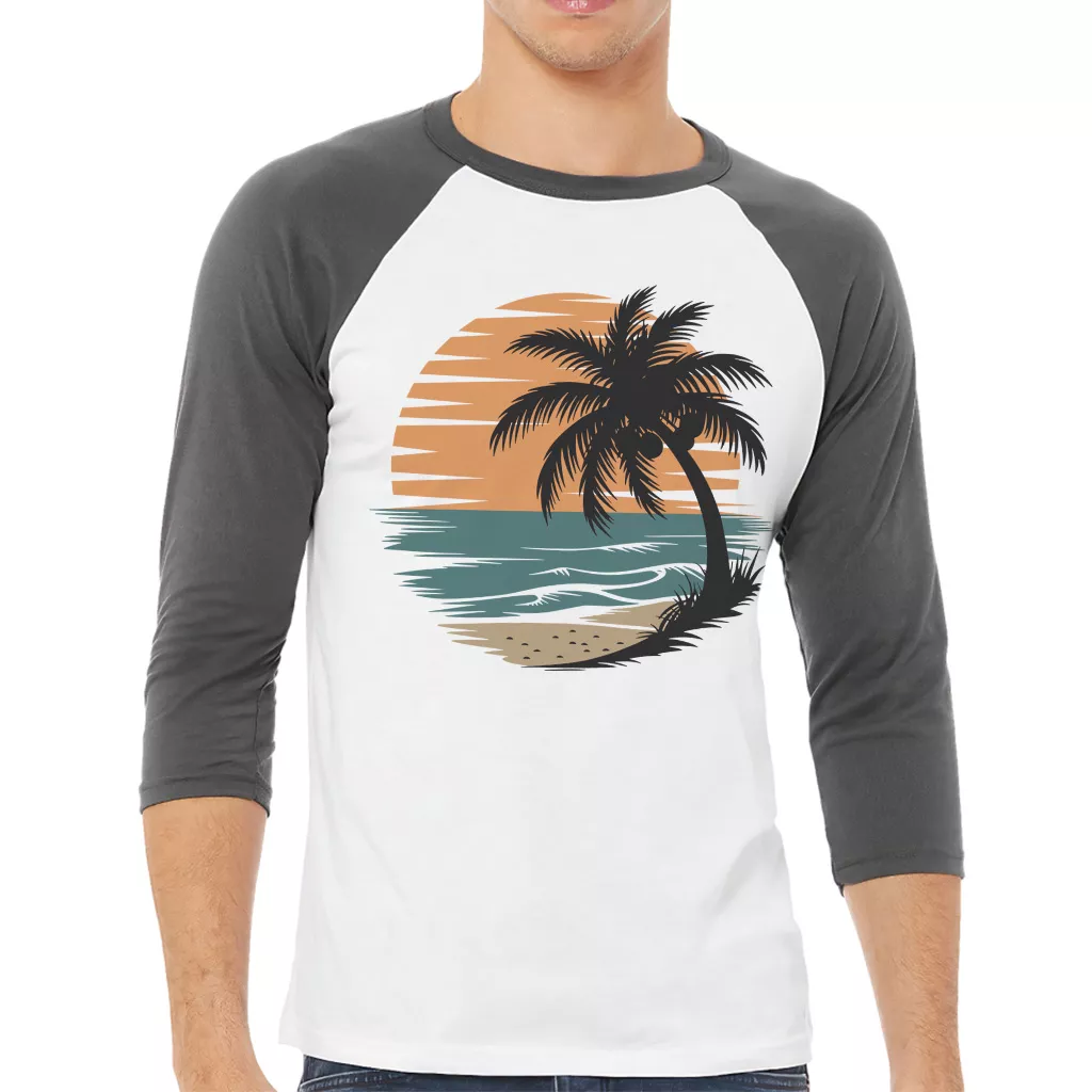 Retro Tropical Sunset Baseball T-Shirt – Trendy Aesthetic 3/4 Sleeve – Summer Palm Raglan Jersey Shirt