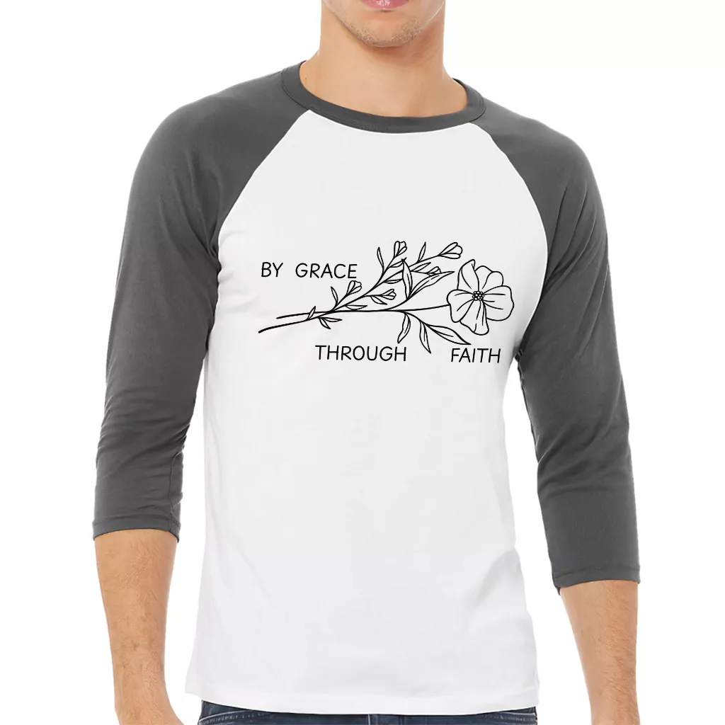 By Grace Through Faith Baseball T-Shirt – Minimalist Christian 3/4 Sleeve – Faith Quote Raglan Jersey Shirt