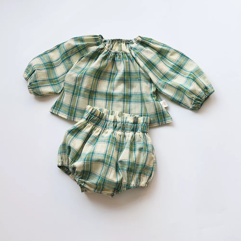 Made from high-quality cotton, this suit offers softness and breathability to keep your little one comfortable all day long. The pullover closure ensures easy dressing, while the adorable O-neck collar adds a touch of elegance to the design. With its vibrant green plaid pattern, this set stands out while providing maximum comfort for your baby.